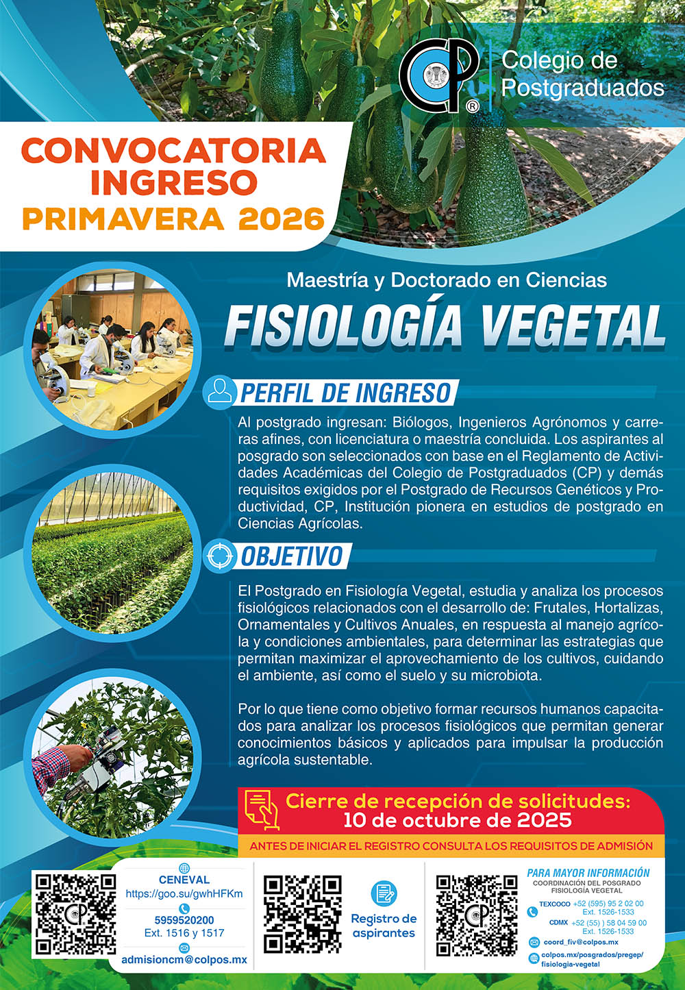 El Postgrado en Fisiología Vegetal, estudia y analiza los procesos fisiológicos relacionados con el desarrollo de: Frutales, Hortalizas, Ornamentales y Cultivos Anuales, en respuesta al manejo agrícola y condiciones ambientales, para determinar las estrategias que permitan maximizar el aprovechamiento de los cultivos, cuidando el ambiente, así como el suelo y su microbiota. Por lo que tiene como objetivo formar recursos humanos capacitados para analizar los procesos fisiológicos que permitan generar conocimientos básicos y aplicados para impulsar la producción agrícola sustentable.