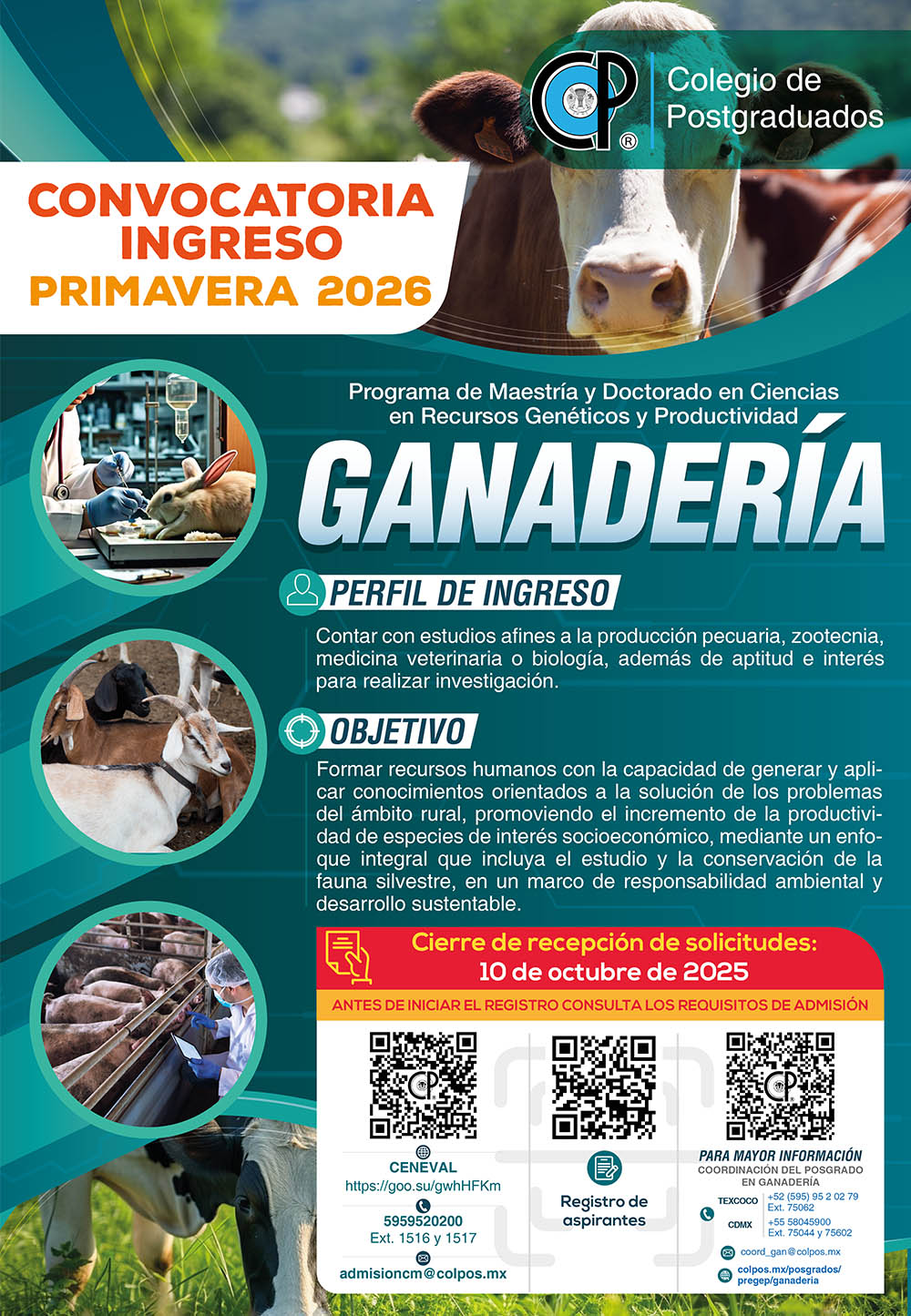 El Programa de Ganadería se inició en 1979 y tiene su origen en el Programa de Ciencia Animal en el Centro de Genética del CP, creado en 1975. El Programa de Ganadería hace énfasis en el análisis y solución de problemas específicos, que afectan la productividad de las especies pecuarias y de fauna silvestre de interés socioeconómico para México. Coadyuva, también con el uso eficiente de estas especies en los diferentes sistemas agropecuarios existentes en el país, para atender la alimentación humana.