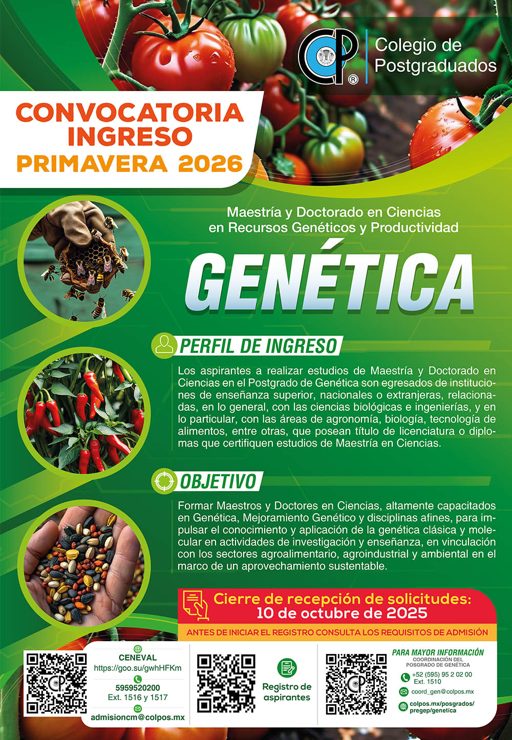 La especialidad de Genética, antes Rama de Genética, fue fundada en febrero 1959, por lo que en este año cumplió 56 años de vida académica. Su programa de Maestría en Ciencias está reconocido por el Padrón Nacional de Posgrados de Calidad del CONACYT como Nivel Internacional. Cuenta con una plantilla de 22 profesores-investigadores, con amplia experiencia y reconocimiento nacional e internacional, de los cuales el 75 % es miembro del SNI.