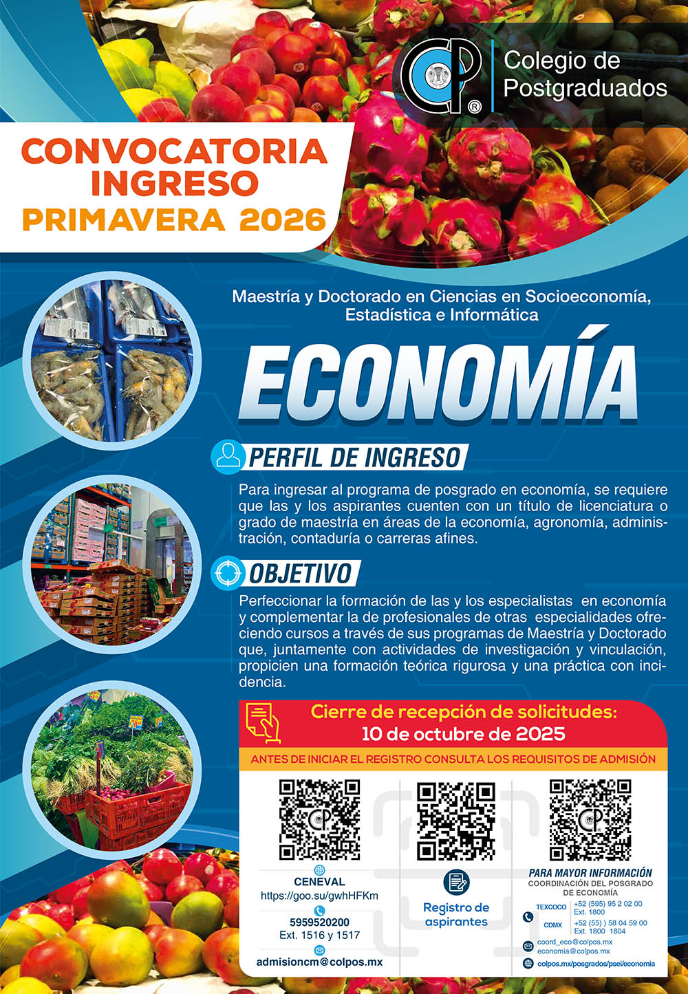 El Posgrado en Socioeconomía, Estadística e Informática – Economía (PSEI-ECONOMÍA) tiene una trayectoria de más de 50 años de expericencia y liderazgo en docencia, investigación y vinculación y es uno de los posgrados pioneros en México en materia de Economía agrícola. La misión del posgrado SEI-ECONOMÍA es formar especialistas en economía con habilidades para abordar problemas de manera interdisciplinaria. En particular, en el análisis y planteamiento de soluciones en el sector económico del campo mexicano El posgrado PSEI-ECONOMÍA ofrece programas de maestría y doctorado; y realiza actividades de vinculación e investigación para complementar la enseñanza teórica en el área.